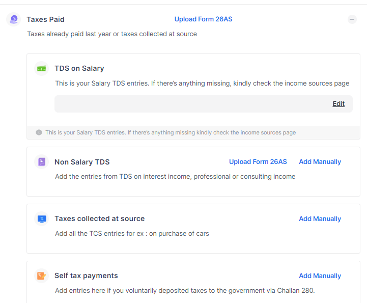 If you have any non-salary income, say, interest income, then add details of tax deducted for such income. You can also add these details by uploading Form 26AS. In the case of uploading Form 26AS, only the TDS details get auto-populated and not the income. Hence you will have to enter the income details in the respective place.