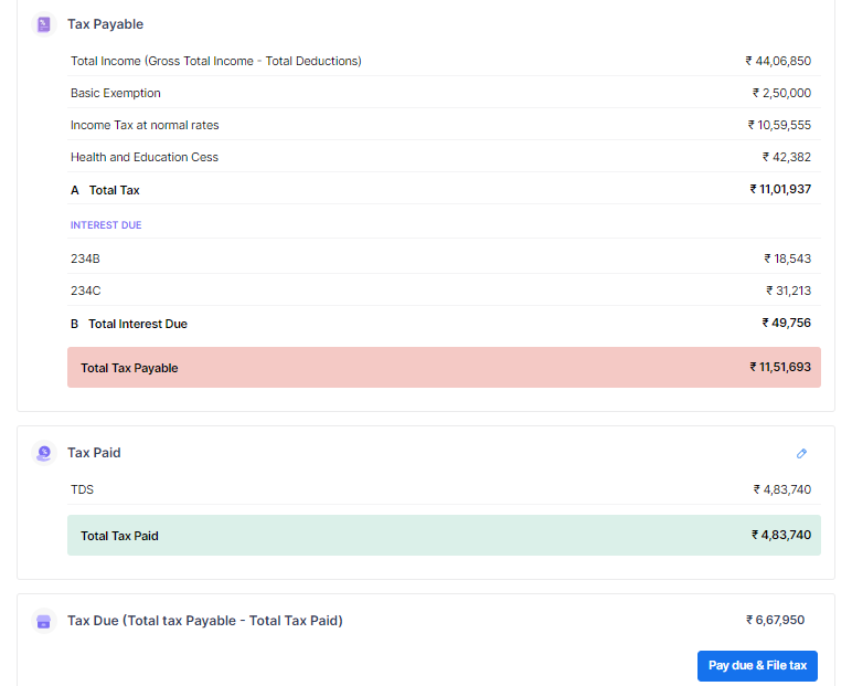 Step 10: On the next page, scroll down, and you can go through all the details filled in by you in each section and edit any of these if required. You can also view the computation of your income tax. The ClearTax portal allows you to switch the tax regime at this stage. You can compare your tax as per both regimes.