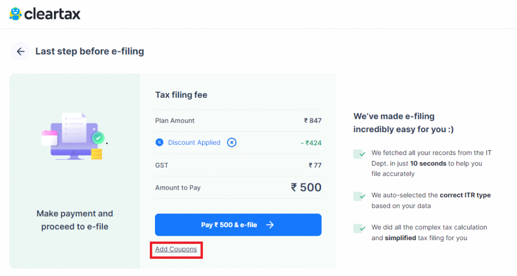 Step 11: Pay Taxes- You can view your tax due status in the computation. If any tax is due to be paid, you can make the payment for it along with the fee for filing services and proceed to e-file.
