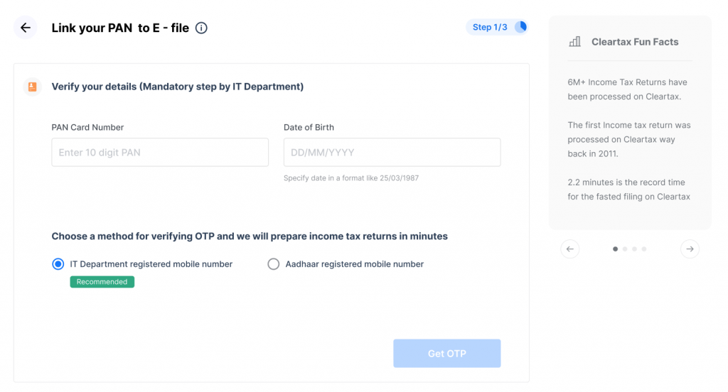 Step 2: ClearTax allows you to access data from the income tax department and pre-fill information for preparing an income tax return. Link your PAN by entering ‘PAN Card Number’ and ‘Date of Birth’.