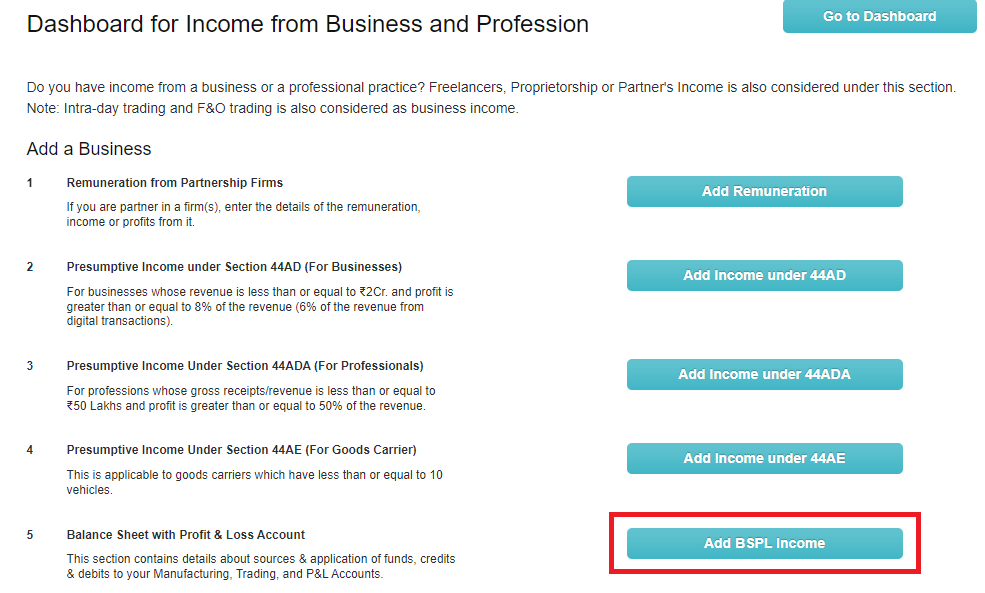 Now, enter the business income tab. Here, you will need to click ‘Add BSPL Income