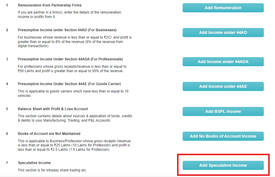 Go back to the dashboard. In the ‘speculative income’ section, enter details of your income from speculative transactions like intra-day trading, etc. .
