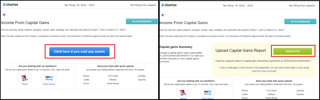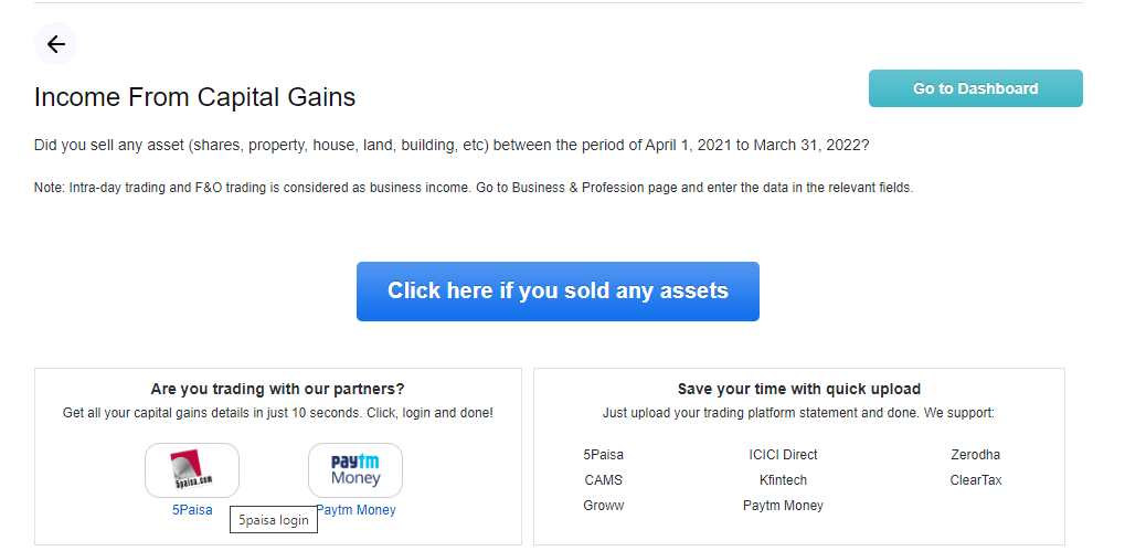 If you are registered with other brokers then click on the button ‘Click here if you sold any assets’. Now, upload the capital gains report. To know how to extract them, click on ‘upload file’ and on the right, you can see the guides on how to download the report on all these platforms. Upload it and all your capital gains from shares and mutual funds are captured automatically.
