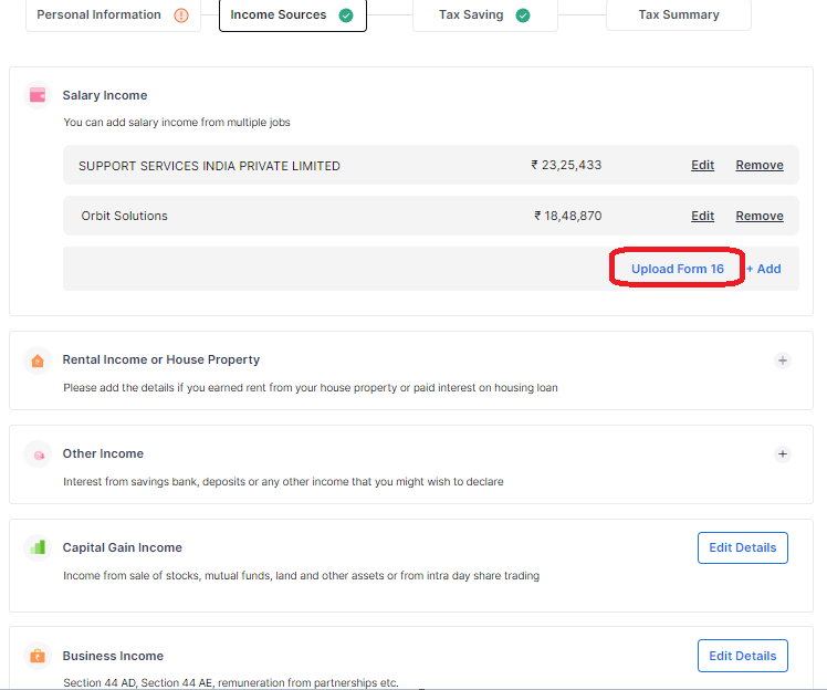 Go to the ‘Income Sources’ tab. Here, your salary details are also pre-filled. Just review the details whether they are correct and edit if required. If you did not select the pre-fill option earlier, you could upload your Form 16 or 26AS PDF to fetch the salary details. Next, you can enter details of rental income or income from house property, other income, and capital gain