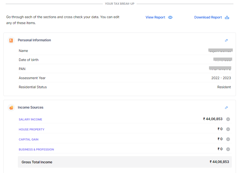 Under the ‘Deductions’ tab, review the investment details (say LIC, PPF, etc.) captured. If you want to add more tax-saving details, you can edit the fields and claim tax benefits here.