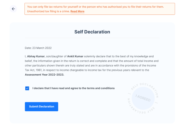 You will need to declare that all the information in return, including the amounts, is correct. This step ensures that you have double-checked the information for its correctness and authorised ClearTax to file ITR on your behalf. To proceed, check the box and ‘Submit Declaration’.